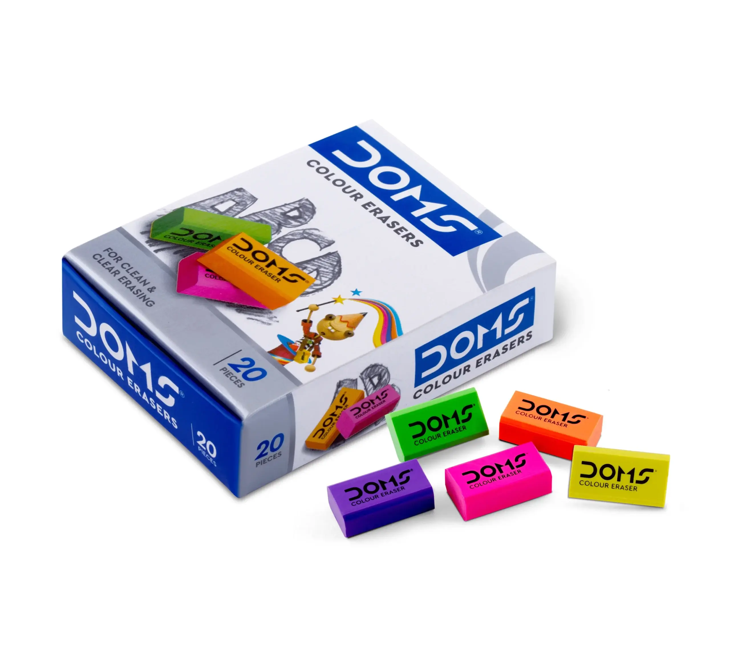 Doms Color Erasers are premium-quality, non-toxic erasers designed for clean and smudge-free erasing of pencil marks. They are available in various vibrant colors and are made with a formulation that produces significantly fewer flakes and less mess during use. These erasers are PVC-free, phthalate-free, and safe for both children and the environment.